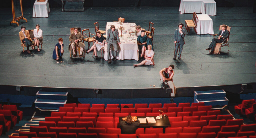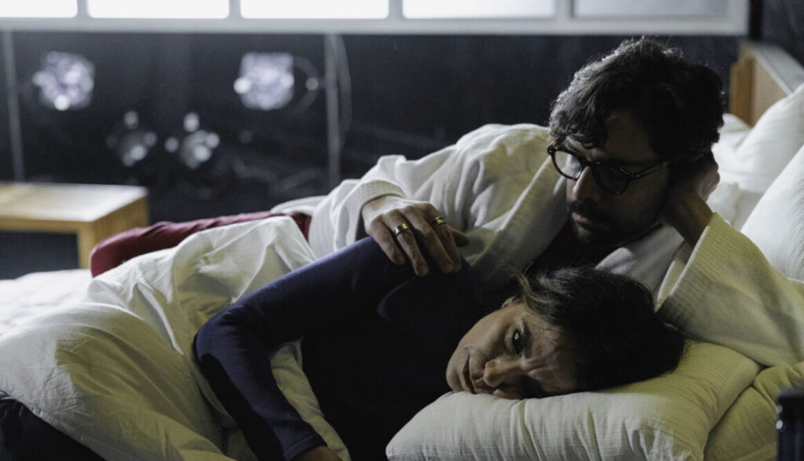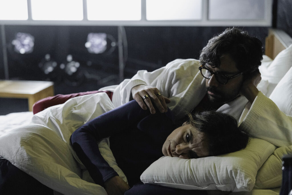 A montagem de Pedro Granato segue, à primeira vista, a linha realista na apresentação do confronto do casal. O palco tem a área da cena delimitada pela cenografia de Marisa Bentivegna, que insere os personagens no espaço descrito na peça (o quarto de hotel), mas com recintos apenas sugeridos, invisíveis aos olhos dos espectadores, como a cozinha do apartamento. Quando a personagem realiza um movimento amplo, largo, para sinalizar a abertura da janela do apartamento, algum estranhamento se impõe. Não parece, contudo, haver a intenção de quebrar com a ambientação proposta, realçada pelas gradações sutis da iluminação de Bentivegna e pelos figurinos de Iara Wisnik, não muito práticos para Paula Cohen, que, ocasionalmente, precisa ajeitar a roupa. De qualquer modo, em dado instante – aquele em que o casal interrompe a sucessão de agressões e volta a se conectar no campo sexual –, a filiação da peça de Rambert à vertente realista é relativizada. A luz adquire tonalidades fortes e exuberantes (vermelho e azul, as cores dos figurinos). E a fisicalidade cotidiana é substituída pela dança executada por Paula Cohen.