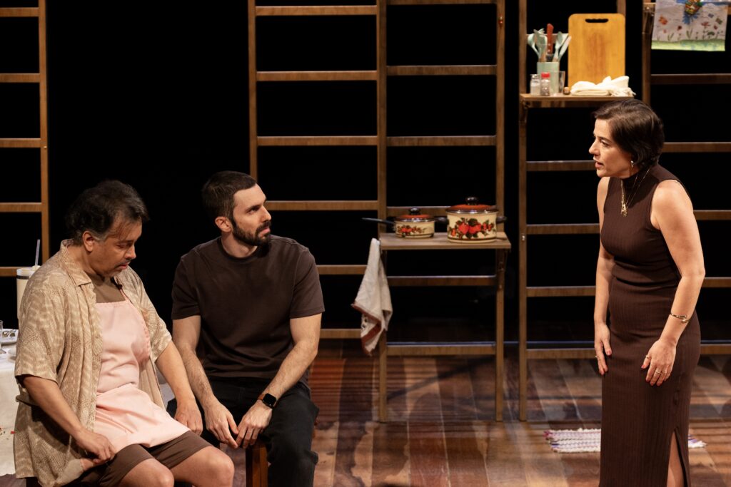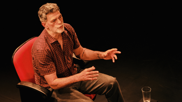 A conjugação entre passado e presente também se manifesta por meio da narração e da vivência dos acontecimentos na atuação de Wagner Moura. Na abertura e no encerramento do espetáculo, o ator se descola de Thomas, seu personagem. Observa-o à distância, comenta sobre ele, reforçando o teatro como instância da ficção, apesar de imprimir uma presença em primeira pessoa, desarmada, não representada. Wagner Moura e Danilo Grangheia aderem à “interpretação invisível”, atravessada pela naturalidade, sem resquícios de impostação. Moura se movimenta com muita fluidez pela variedade de estados emocionais de Thomas, que oscila entre a sobriedade de explanações contundentes e os rompantes de descontrole. Já Grangheia é menos catártico, em sintonia com um Peter sempre provocador, e se destaca não “apenas” através da fala como da escuta. Os dois atores demonstram pleno domínio da palavra. Julia Bernat, como Petra, filha de Thomas, transita da postura racional ao extravasamento.