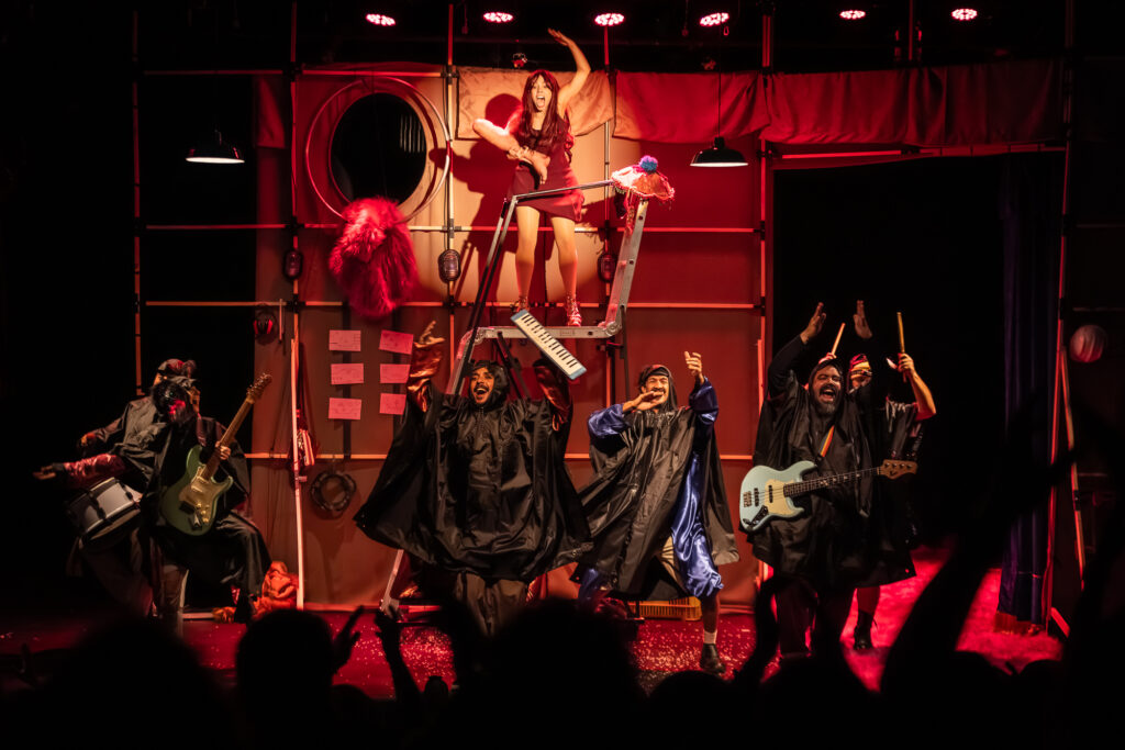 Os diretores apostam numa estética do rascunho e, ao mesmo tempo, numa estilização evidenciada, contraste bastante presente na iluminação de Ronaldo Costa, que opõe a neutralidade à explosão cromática. O elenco também oscila entre um certo desmonte da representação, própria à reprodução de uma atmosfera cotidiana, e composições assumidamente marcadas, caricaturais, sublinhadas pelos figurinos extravagantes de Maria Esther. Caju Dantas, Diogo Spinelli, Erivaldo Oliveira, Giordano Castro, Lucas Torres, Mário Sergio Cabral, Olivia León e Paula Queiroz enveredam por esses registros interpretativos diversos, demonstrando domínio técnico (de corpo e voz) e timing.