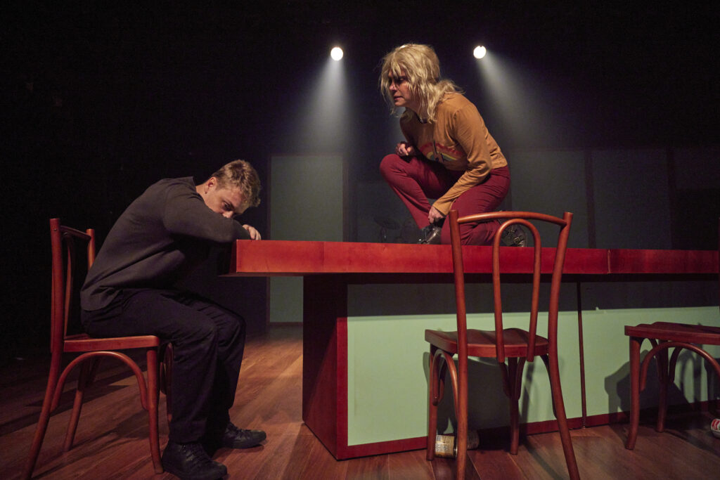 Os personagens representam propostas artísticas distintas. De um lado está Monique, porta-voz de uma encenação transbordante, física, que surpreende, como no instante em que uma parede subitamente cai para revelar a personagem/atriz tocando bateria. De outro, Édouard, símbolo de uma montagem mais convencional, cerebral, a exemplo da cena em que aparece sentado, diante do notebook. A junção dessas duas linguagens gera algum desequilíbrio nesse espetáculo dirigido por Inez Viana.